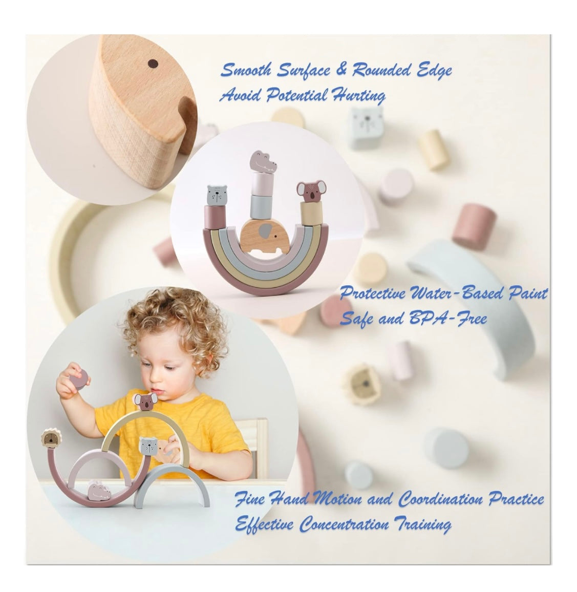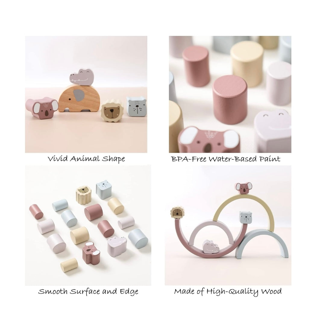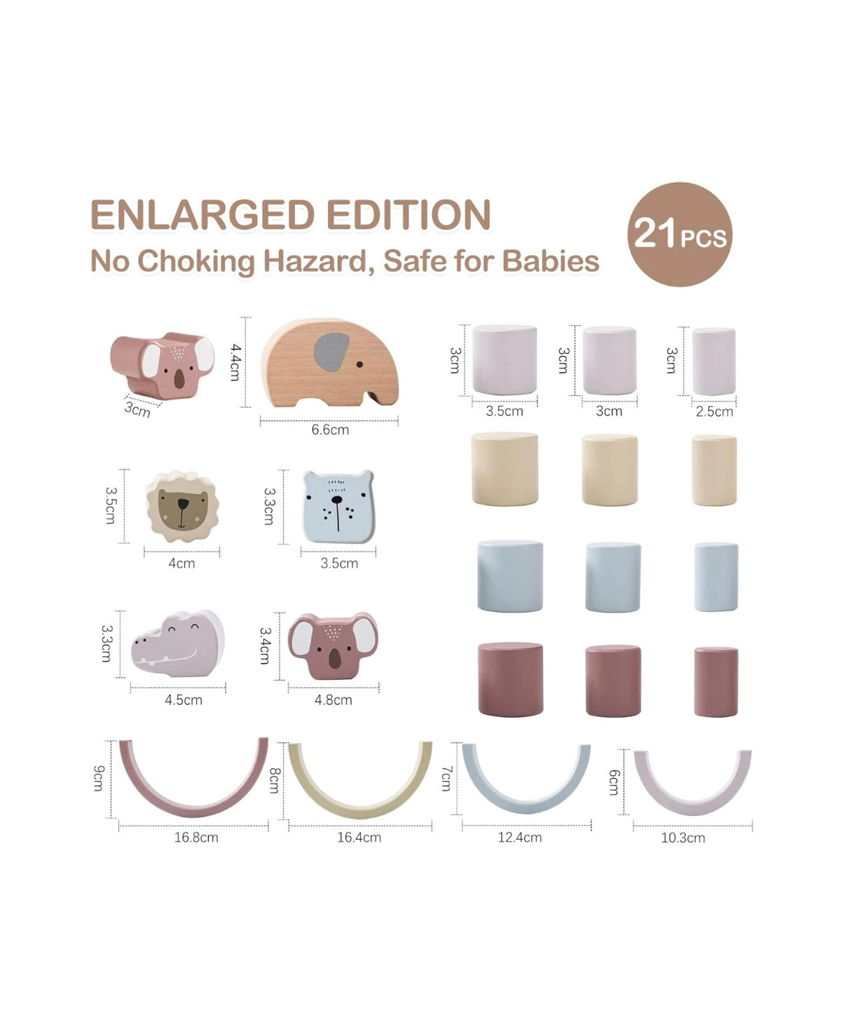 - 21 Macaroon Colored Block Set: 4 rainbow-shaped building blocks, 5 wooden animals, 12 cylindrical building blocks and 1 storage bag. Sized for Tiny Baby Hands. Little players can learn about colors and animals.