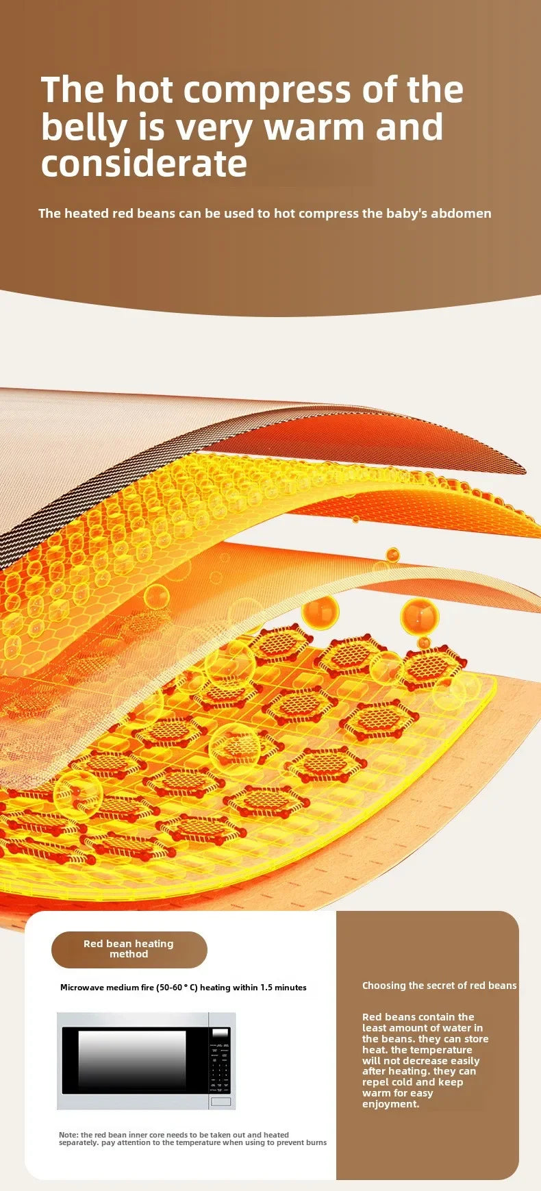 - When warming up, take out the red bean liner and heat it separately in the microwave for safe, cozy comfort.