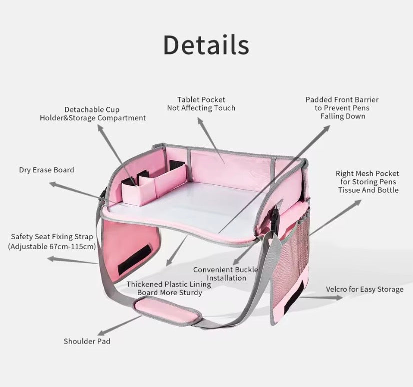 Make every journey cleaner, calmer and more enjoyable with our Multi- Functional Travel Tray, designed to keep little hands busy and essentials neatly organized on the go. Perfect for car rides, flights and stroller outings, this all in one tray creates a dedicated space for play, snacks, drawing and screen time- anywhere your child travels.